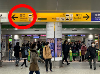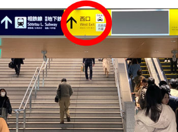 JR横浜駅改札を出たところです。改札を出て、「西口」の方面に進んでください。出る改札によって「西口」の方向は左右異なります。